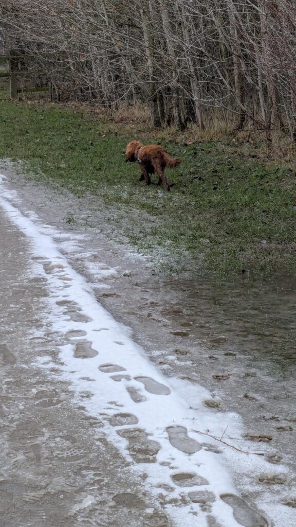 Today’s walk was… moist. The kind of slushy, icy, ankle‑deep nonsense that makes you question why you ever leave the house, but Bob? Oh, Bob was living his best life.